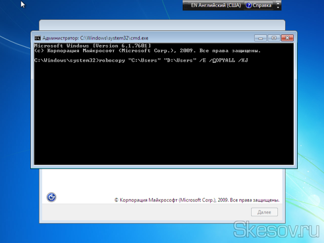 robocopy “C:Users” “d:Users” /E /COPYALL /XJ