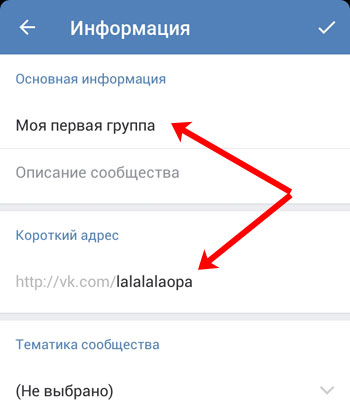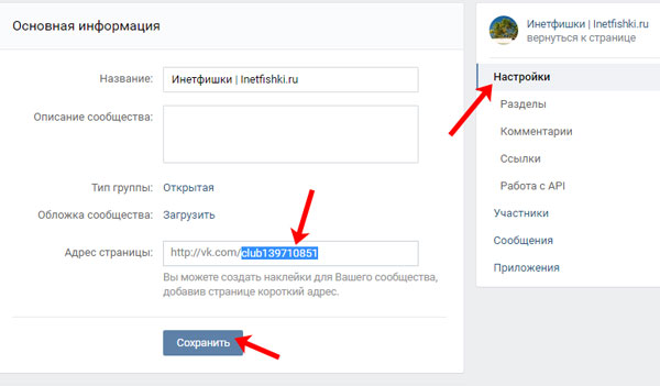 В розділі «Основна інформація», змініть назву групи, в розділі «Коротка адреса» введіть нове посилання.