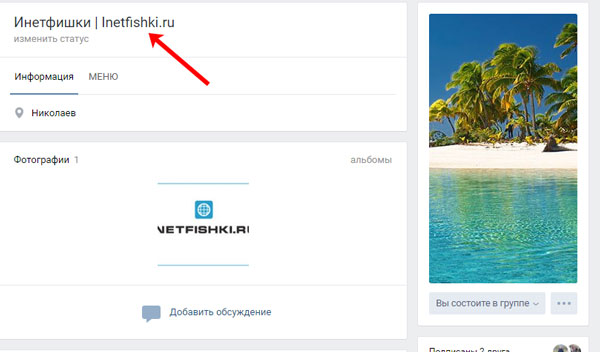Назва відображається на головній сторінці групи вгорі.