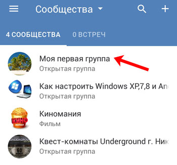 Якщо Ви хочете змінити назву і посилання на свою групу через додаток Вконтакте, встановлене на вашому телефоні або планшеті, тоді в бічному меню клікніть по пункту «Групи».