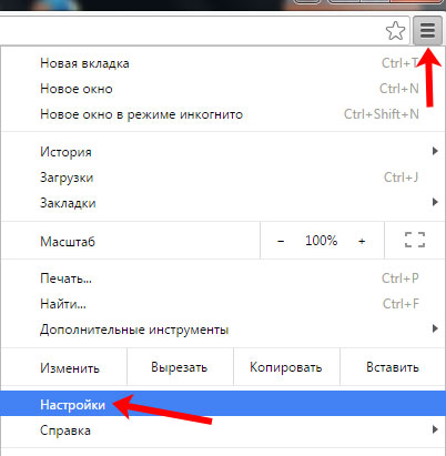 Запускаємо браузер і клікаєм по кнопочці у вигляді трьох горизонтальних смуг в правому верхньому куті. Виберіть зі списку «Налаштування».