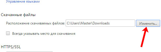 Знайдіть розділ «Викачані файли». Щоб змінити папку, в яку будуть зберігатися завантажені файли через Хром, натисніть «Змінити».