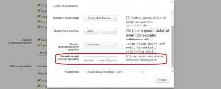 Використовуючи повзунок, ви зможете відрегулювати розмір шрифту до необхідного для вас значення. Також при цій настройці існує область попереднього перегляду», тобто, регулюючи значення ви відразу побачите, як буде виглядати текст на веб-сторінках.