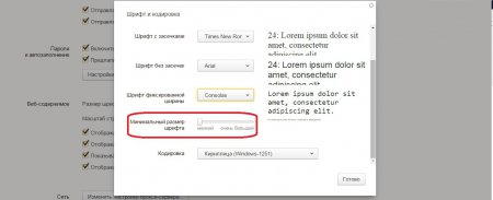 Для більш детального налаштування шрифтів в Яндекс браузері клацніть по кнопці «Налаштувати шрифти» і в діалоговому вікні, відшукайте «Мінімальний розмір шрифту».