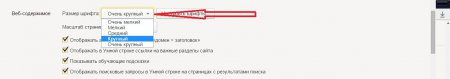 4. Першою налаштуванням у цьому розділі якраз і варто розмір шрифту. За замовчуванням в Яндекс браузері варто розмір шрифту «Середній». Щоб змінити на інший просто клацніть по цій клітинці і в контекстному списку виберіть «Великий» або «Дуже великий» шрифт (якщо ви хочете зменшити шрифт, то відповідно виберіть «Дрібний» або «Дуже малий»).