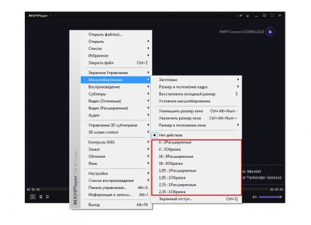 Також у KMPlayer можна зробити налаштування “Стан сторін”. Для викликаємо все теж контекстне меню, але тепер знаходимо команду “Масштаб”, а потім вибираємо одну з необхідних вам станів (на зображенні нижче доступні варіанти обведені в червоним прямокутником).