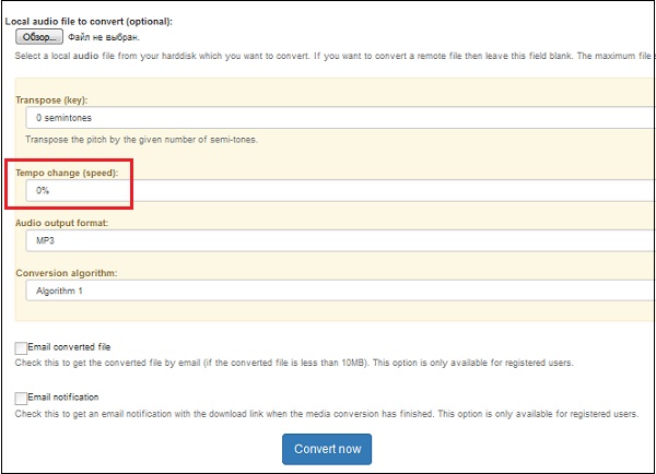 Як випливає з його назви, даний англомовний сервіс призначений, в першу чергу, для конвертації аудіофайлів онлайн з одного формату в іншій. При цьому на даному сервісі є також інструмент для зміни темпу і тональності музичної композиції, який ми можемо використовувати для наших завдань.
