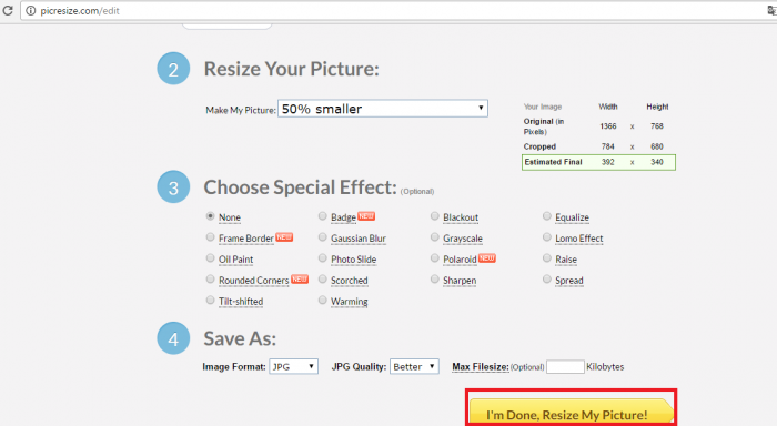 Відмотайте сторінку нижче, щоб побачити ще більше параметрів зображення, які можуть бути змінені. Якщо ви закінчили форматування картинки, то натисніть на пункт «i’m Done, Resize….», і фотографія почне викачуватися.