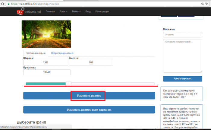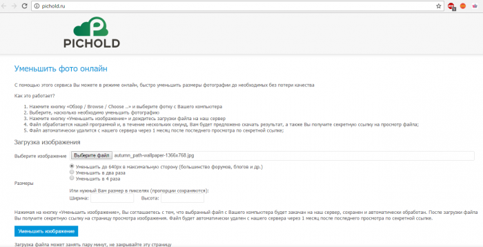 Для зменшення розміру картинки, зайдіть на основну сторінку і завантажити у відповідному полі картинку з миші в браузер. Зображення буде завантажене.