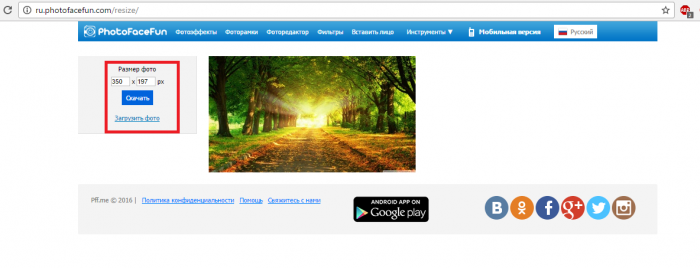 Після завантаженого зображення, знайдіть в меню «Фотошоп» пункт «picture Resize». Через кілька секунд сервіс автоматично зменшить фото до оптимальних розмірів. Після завантаження зображення, вікно редагування автоматично здасться поруч, введіть необхідні значення. Після закінчення редагування – завантажте фото собі.