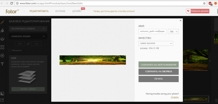 Для скачування результату, натисніть на кнопку «Зберегти». Після чого Вам буде запропоновано вибір якості, розміру і інших деталей. Крім збереження на ПК, картинка може бути відправлена в DropBox, або відразу на друк.