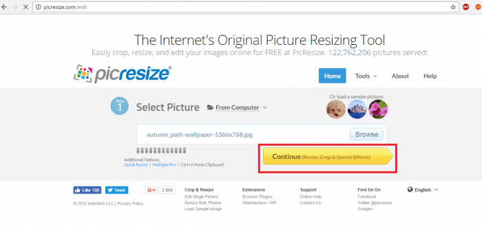 Для початку роботи з сайтом, виберіть потрібну фотографію з ПК. Завантажте файл на сайт. Тепер натискаємо на «Продовжити» (Continue);