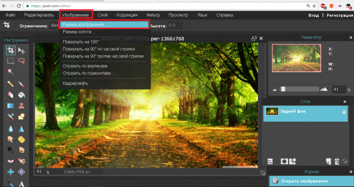 Напевно він вже зустрічався Вам, адже цей стандартний фотошоп онлайн. Крім того, що він підтримує безліч фільтрів і ефектів на зображення, він також з легкістю може перетворити фотографію в потрібний розмір. Працювати з нею нескладно. Завантажте фото на сайт, натисніть на потрібне зображення. У списки функцій виберете «Розмір зображення».