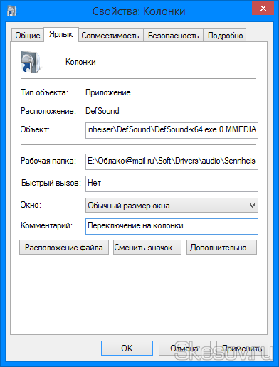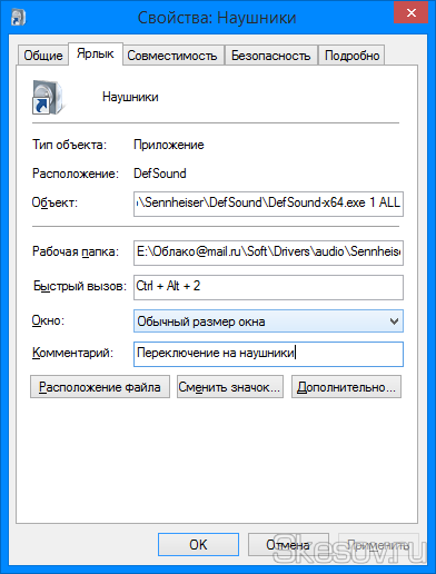 4) Далі спрощуємо життя і задаємо гарячі клавіші для перемикання між звуковими картами. Для цього використовуємо параметр «Швидкий виклик» на цій же вкладці властивостей ярликів. Я задав поєднання клавіш «Ctrl+Alt+1» для перемикання колонок і «Ctrl+Alt+2» для переключення на навушники. Натискаємо ОК для застосування всіх змін.
