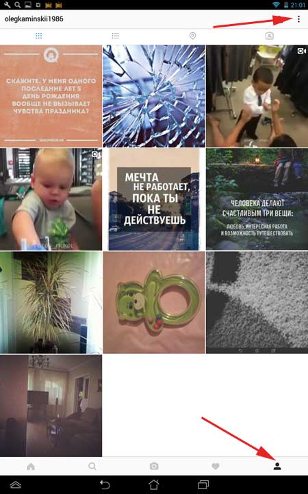 Запускаємо додаток Инстаграма. Переходимо на головну сторінку облікового запису. Натискаємо на значок чоловічка в правому нижньому куті.