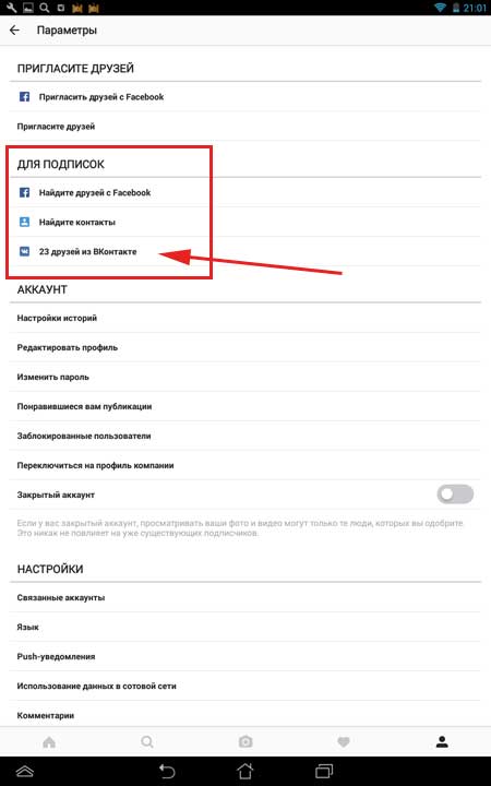 Така можливість передбачена розробниками Инстаграма. Причому вам не доведеться нікого шукати вручну, достатньо лише зайти в настройки свого облікового запису. Давайте цим і займемося. Ясна річ, що на вашому пристрої має бути інстальовано Инстаграма і додаток Вконтакте.