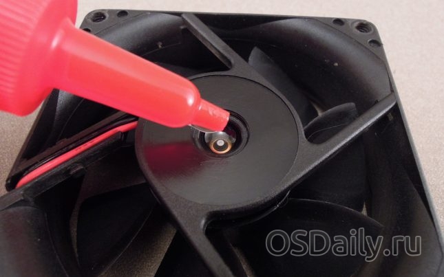 - Далі ми змастимо підшипники вентиляторів, для того щоб вони працювали як можна тихіше. Для цього на лицьовому боці вентиляторів, є наклейки, отклеив які і капнувши кілька крапель олії в дірочку, ми промаж підшипники. Якщо наклейки на ваших вентиляторах немає, то необхідно зняти вентилятори і капнути кілька крапель олії з задньої сторони в дірочку.