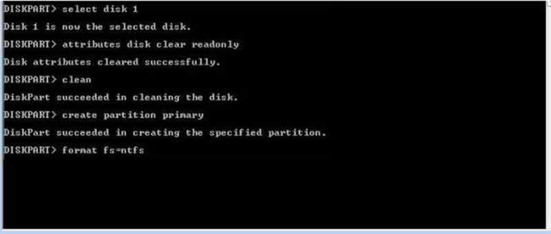 Запуск командного рядкаБажано також відформатувати флешку. Для цього перед самим початком маніпуляцій з носієм перезапишіть дані на жорсткий диск комп’ютера. Тепер, після зміни атрибутів, достатньо ввести clean, create partition primary format fs = ntfs (NTFS) або format fs = fat (для FAT). Як і раніше, після кожної команди натискайте Enter.