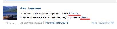 В даному прикладі слова «Олега» і «Аню» стали посиланнями на акаунти цих користувачів.