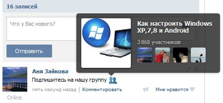 Тут все робиться точно також, просто замість адреси сторінки вводимо адресу співтовариства. Я, наприклад, вводжу знову ж у текстове поле на своїй сторінці наступний запис: