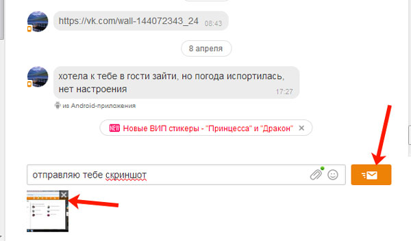 Отримане зображення сторінки Однокласників можна відправити повідомленням будь-якому користувачеві. Докладно про це я писала у статті: як зробити і відправити скріншот Вконтакте. У Вас будуть Однокласники, але принцип той же: відкривайте діалог, і прикріплюйте фотографію.