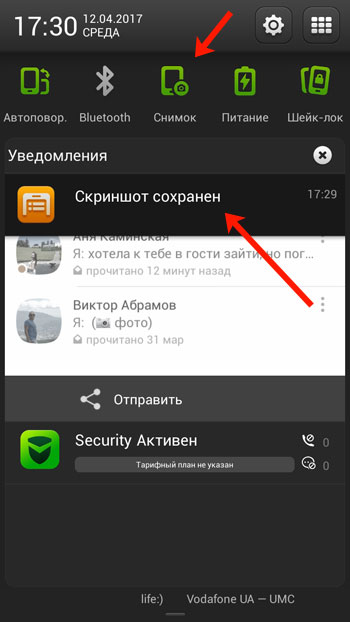 До речі, у мене на телефоні в рядку повідомлень є кнопка «Знімок», натиснувши на неї, можна отримати скріншот поточного екрана. Подивіться, може і у Вас така є.