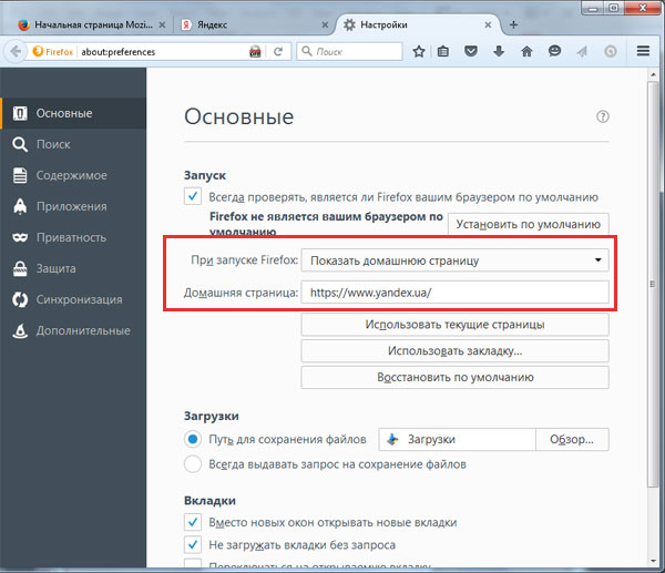 Відразу у вкладці «Основні», вказуємо, щоб при запуску Firefox показувалася домашня сторінка, а в якості домашньої вказуєте вже потрібний сайт. У моєму випадку це Яндекс, який там стоїть ще після використання першого методу.