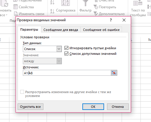 – І, в-третє, у вікні слід відкрити першу вкладку і вибрати елемент, як це зроблено на малюнку нижче. Виконавши ці дії, у визначених місцях буде створено перелік. У порожньому полі, слід вказати діапазон клітинок, які потрібно заповнити.