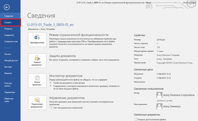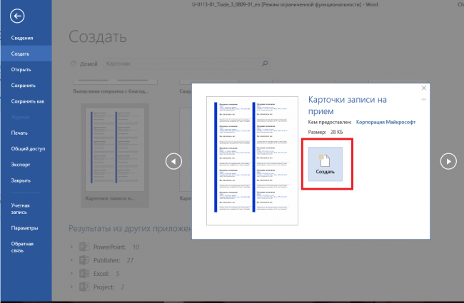 Щоб перейти до вбудованих шаблонів по створенню візиток, перейдіть в пункт “Створити”.
