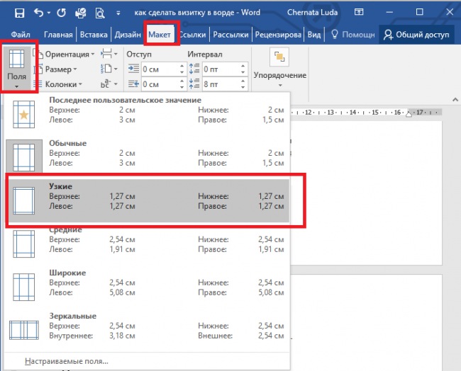 Перед створенням вкажіть необхідну розмітку документа. Спеціально для цього натисніть на вкладку “Макет”. Далі виберіть всі необхідні параметри полів. У наступному списку слід вибрати “Вузькі”.