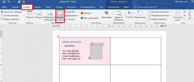 Для додавання в поле візитки логотип або картинки, треба скористатися вкладкою “Вставка”, а потім вибрати малюнок або фігури.