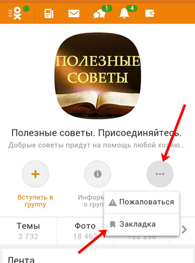 Щоб додати в закладки телефону, відкрийте її і під головним фото і назвою також є кнопочка із зображенням трьох горизонтальних точок, натисніть на неї, потім виберіть зі списку «Закладка». Група буде додано.