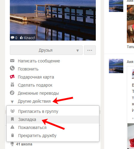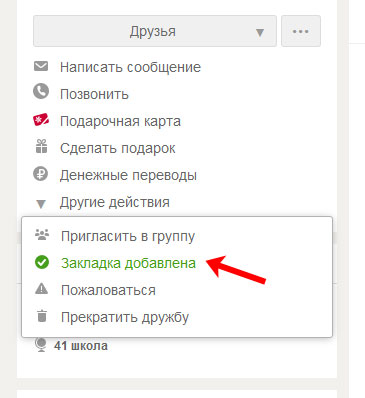Після цього відкриється головна сторінка його профілю. Під аватаркою є невелике меню. Клікніть по пункту «Інші дії» і виберіть з випадаючого списку «Закладка».