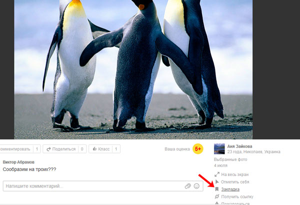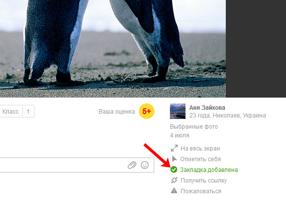 Якщо Вам сподобалось фото або зображення в Однокласниках, і Ви хочете додати його в список закладок, тоді клікніть по ньому, щоб воно повністю відкрилося, перегорніть трохи вниз, праворуч буде меню, виберіть в ньому пункт «Закладка».