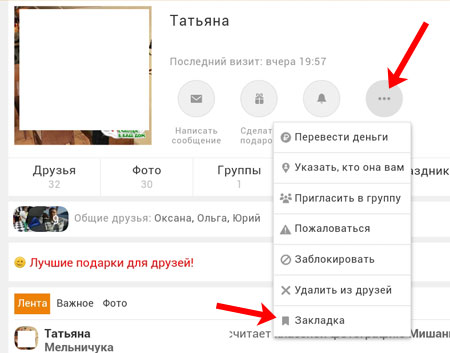 Після того, як у Вас відкрився профіль вибраного людини, знайдіть кнопочку з трьома горизонтальними точками – вона буде праворуч від головної фотографії, і клацніть по ній. Відкриється список, що випадає, виберіть в ньому пункт «Закладка». Тепер ця людина є у Вас у списку закладок.