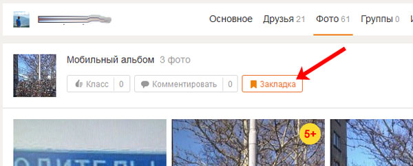 Додати закладку можна не тільки на одне фото, а й на весь альбом. Для цього в групі або в одного, зайдіть в меню «Фото», знайдіть потрібний альбом і клацніть по ньому. Потім під назвою натисніть на кнопочку «Закладка». Тепер альбом доданий до Вас в закладки, і можна швидко перейти до перегляду доданих до нього фотографій.