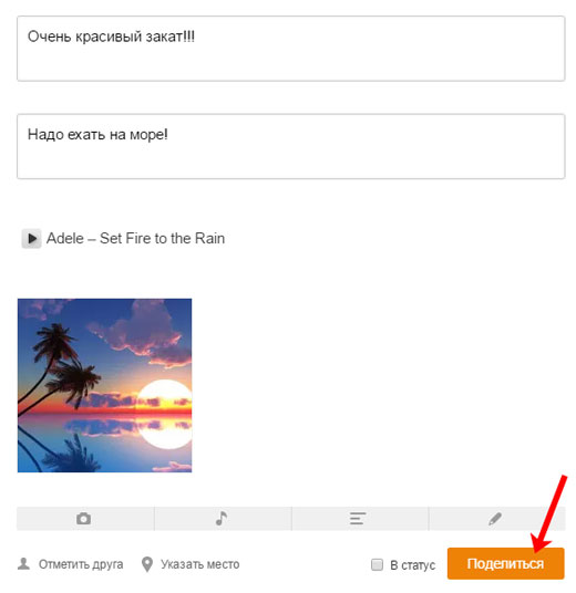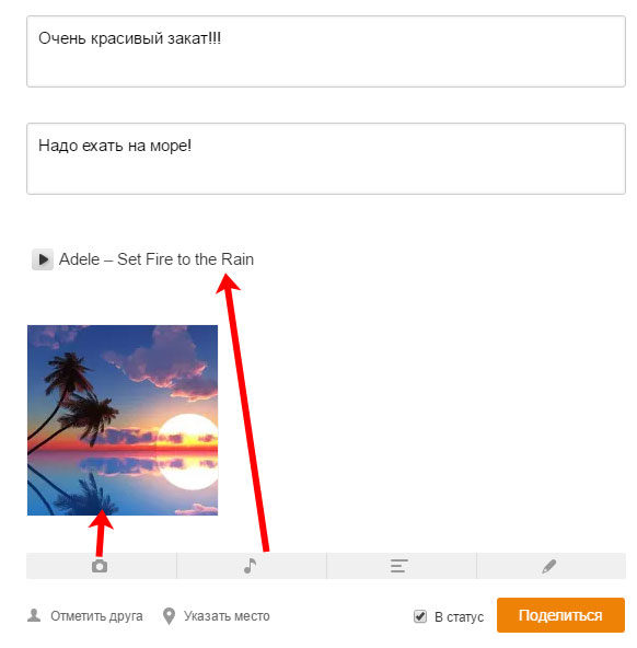 Використовуючи інші кнопки, можна додати замітку музику – зображення ноти, або зробити замітку в Однокласниках з фотографією – зображення фотоапарата.