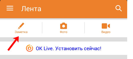 Якщо ви хочете створити замітку в Однокласниках з телефону або планшета, відкрийте мобільний додаток і в меню зверху клікніть по кнопочці «Замітка».