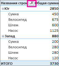 – Для виділення елементів таблиці та їх рівномірного накладення вручну, слід відсортувати вміст або ж провести фільтрацію. Взагалі, зведена таблиця є прототипом маленької бази даних, проводити фільтрацію якої можна, при появі необхідності швидкого перегляду лише потрібних колонок і рядків. Нижче на малюнку, можна побачити приклад зведеної таблиці після фільтрації вмісту. Завдяки цьому, з’являється можливість швидко переглянути обсяг продажів у зазначених регіонах.