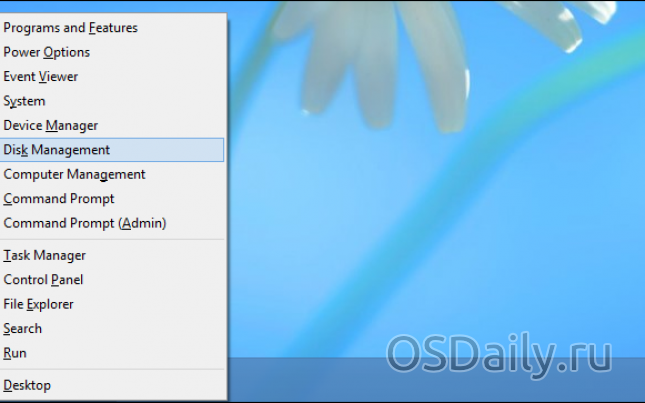 Щоб скористатися їй, натисніть Windows + X або клацніть правою кнопкою миші по лівому нижньому кутку екрану і виберіть опцію Управління Дисками (Disk Management).