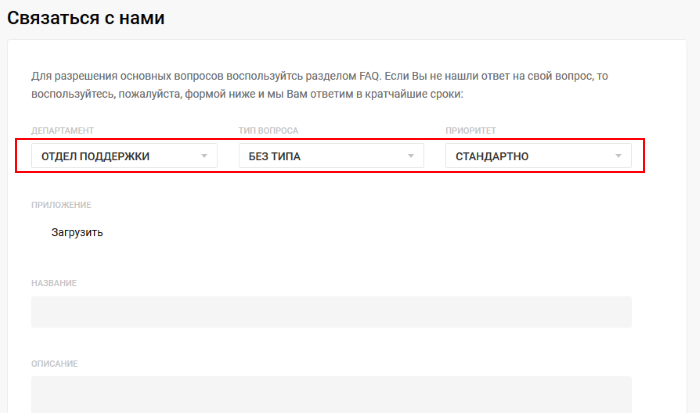 • Відкриється форма, де потрібно вибрати «Відділ підтримки», «Тип питання», «Пріоритет». Тип питання – тут потрібно вибрати один з трьох типів звернення в підтримку. Виберіть пріоритет вашого звернення. Найкраще вказати «Терміново» для отримання відповіді як можна швидше.