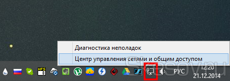 Якщо ж ви хочете настроїти тільки один комп’ютер або у вас ще немає роутера і домашньої локальної мережі, тоді підемо іншим шляхом. В треї тиснемо по значку «Мережа» правою кнопкою і вибираємо «Центр управління мережами і загальним доступом».