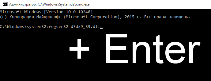 - Далі, у службовому вікні вводимо «regsvr32 d3dx9_39.dll» і, відповідно, підтверджуємо правомірність своїх дій активацією клавіші «Enter».