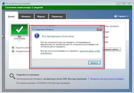 Як ви зрозуміли, Microsoft Security Essentials сам повністю відключає «Захисника Windows». До речі, не виключено, що деякі антивіруси можуть робити теж саме.