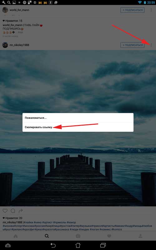 Після установки zoom for instagram запускаємо безпосередньо додаток самого Инстаграма. Далі знаходимо фотографію, яку необхідно збільшити. У правому верхньому кутку від фотографії натискаємо на меню у вигляді трьох вертикальних точок. З’явиться віконце, в якому потрібно буде вибрати пункт «Копіювати посилання».