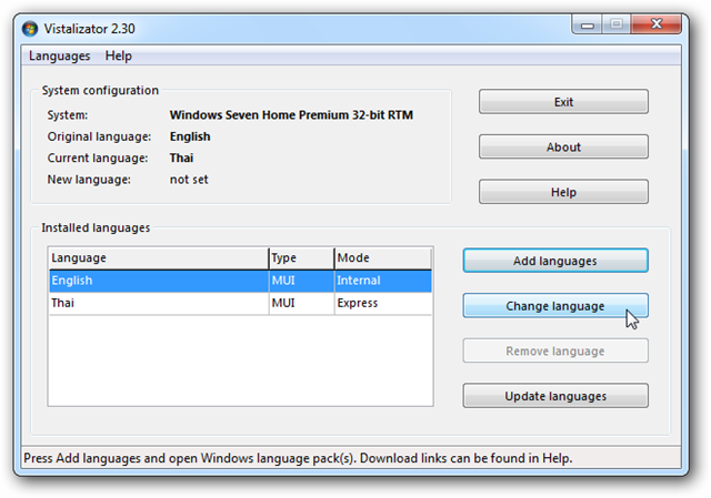 Щоб додати мова інтерфейсу в Windows 7 і Vista (в незалежності від видання), спочатку скачайте Vistalizator. Потім з тієї ж самої сторінки скачайте за своїм вибором мовний пакет. Мовні пакети розрізняються в залежності від встановленого пакета оновлень (service pack) Windows, тому переконайтеся, що ви вибрали правильну версію пакету.