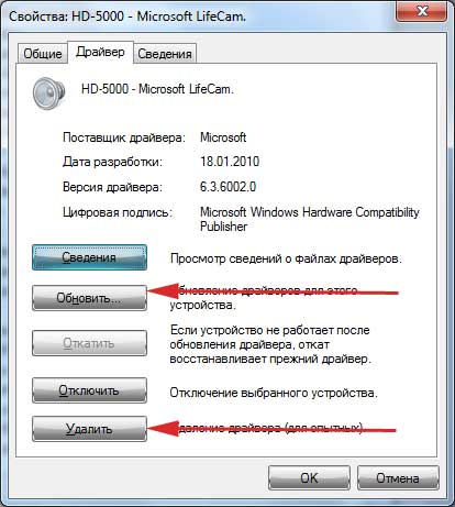 В наступному віконці переходимо у вкладку «Драйвер». Там є кнопки для поновлення або видалення драйвера веб-камери. Тобто ми можемо при наявності у нас нового драйвера або відразу оновити або видалити старий і установити новий.