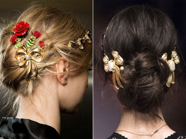Не забувайте про ефектні шпильки і різні елементи декору для волосся, яких продемонстровано в достатку на сьогоднішній день. Навіть самі звичайні невидимки при грамотному використанні дозволять створити чудову новорічну зачіску.