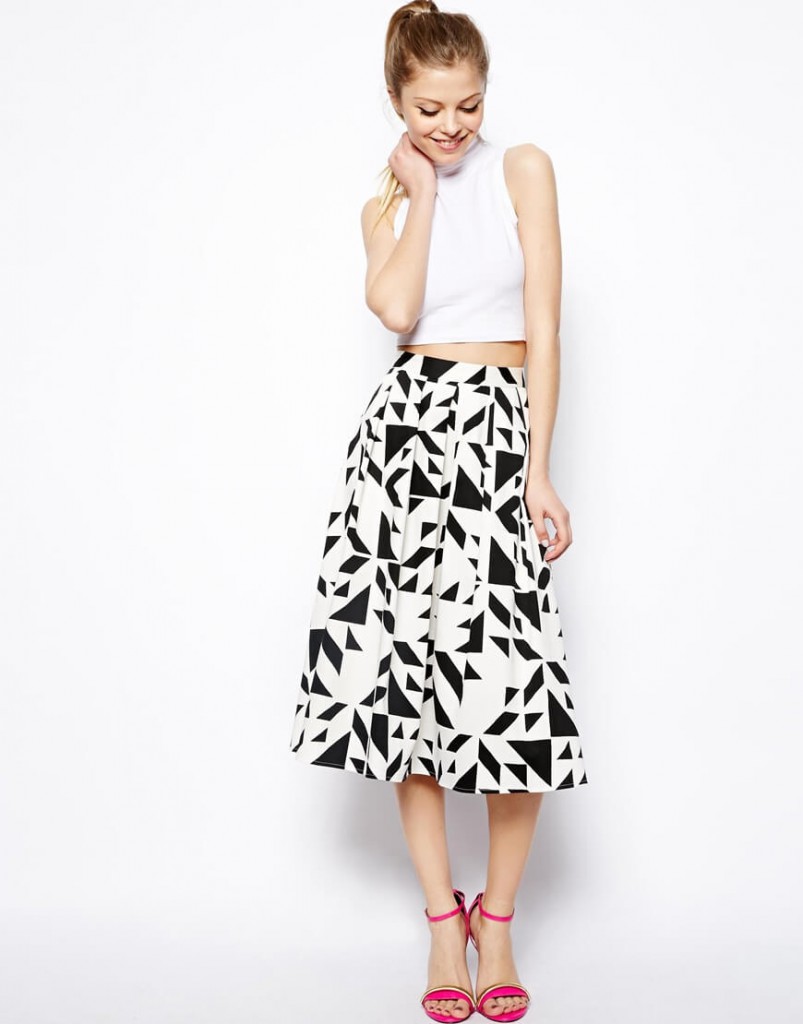 Що стосується спідниць, можна собі дозволити такі фасони — прямий, спідниця-олівець, А-подібний крій. Довжина, яку можна собі дозволити — до коліна, плюс-мінус 5 див. Жінкам невисокого росту підійдуть моделі трохи вище коліна. Для повних жінок відмінно підійде спідниця-олівець. Неприпустимі ультракороткі моделі, вони виглядають безглуздо на тілі 40-річної жінки. Також не підходять пишні фасони «а-ля пачка».