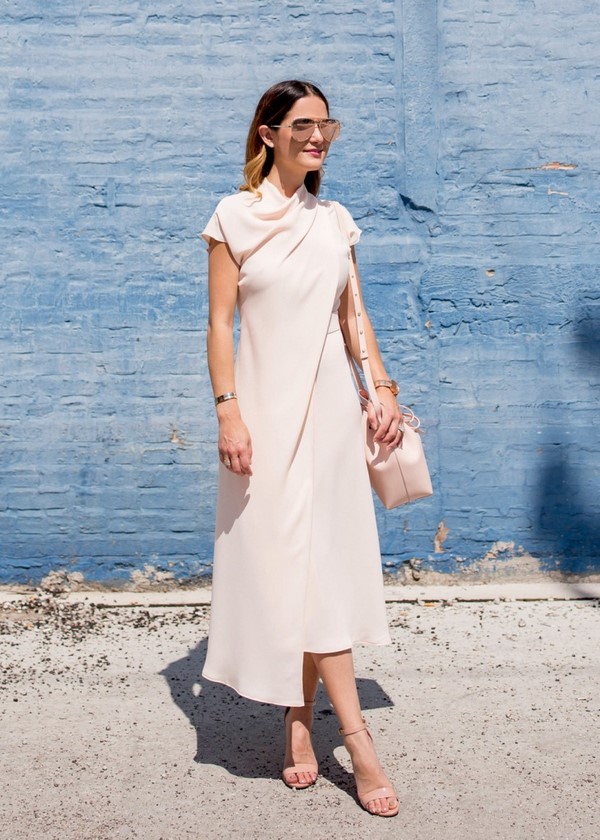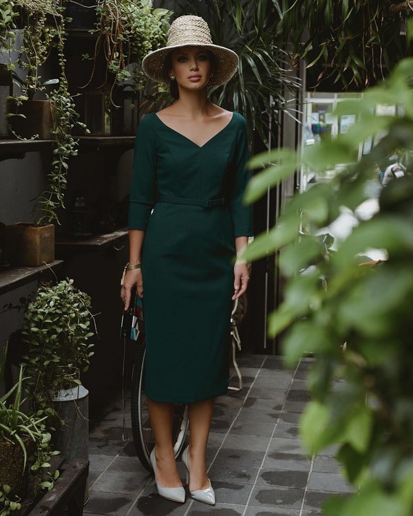 Фасони сукні міді для офісу можуть бути у вигляді футляра або помірно розкльошена до низу спідниця, що дуже елегантно і стильно. Дивіться трендові луки з офісними міді сукнями в галереї трохи нижче.